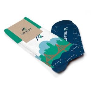 Our team was up to the task! We created custom sock designs based on their new branding that MyVest's team used for trade show giveaways, event swag, employee appreciation, and corporate gifts. About working with Sock Club, Walley wrote; "I have been super impressed by your service and am SO looking forward to getting our socks!"